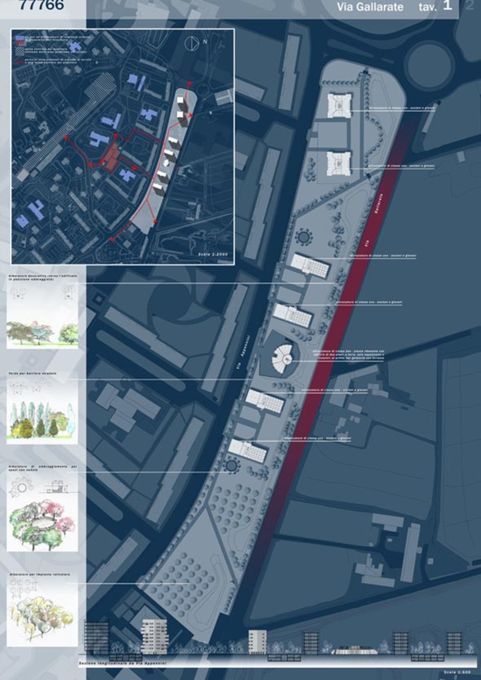 La parte nord del Quartiere invece è più densa di edifici ed è priva di consistenti spazi di verde e di riserve di terreno libere da costruzioni, mentre all’interno dei nuclei edificati si sviluppano, con forma articolata, porzioni di verde di vicinato che costituiscono un importante elemento di relazione fra le diverse parti, ma che non hanno la consistenza di veri e propri “giardini pubblici organizzati”. D’altra parte il limbo di terra su cui si sviluppa il progetto, per la sua posizione marginale aderente all’asse di traffico di via Gallarate non risolverebbe il probelma del rapporto verde-insediamnti nemmeno se fosse interamente destinato a parco. Giusta quindi la soluzione proposta dall’Amministrazione Comunale, che tende a risolvere insieme più problemi: realizzare una protezione dal traffico di via Gallarate, offrire una dotazione di spazi di riposo, incontro, gioche per gli abitanti insediati lungo via Apennini, risanare un’area degradata dando “qualità” al margine del quartiere e infine costruire uno spazio presidiato e sicuro.
