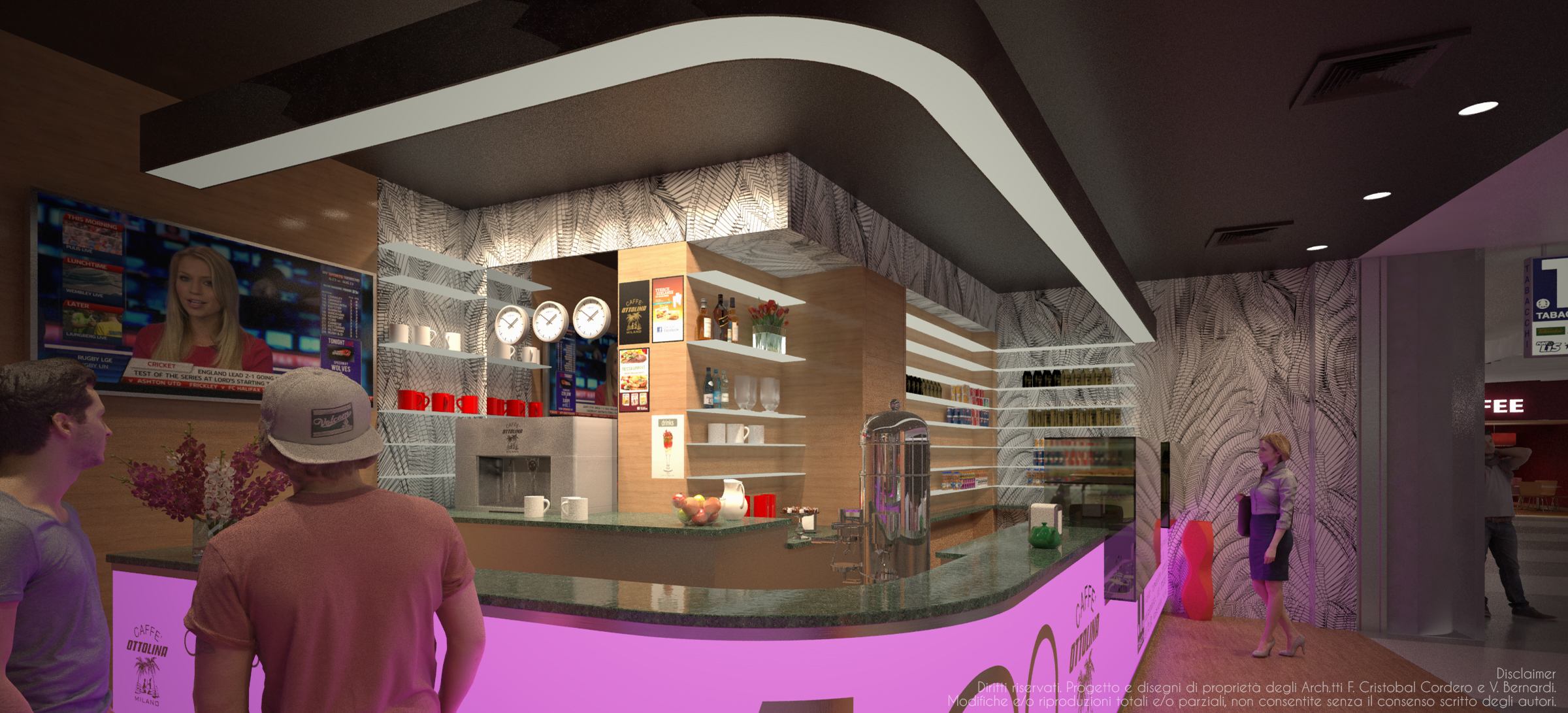 Il design si caratterizza per un bancone curvo e sinuoso, illuminato da una luce soffusa color magenta che crea un’atmosfera intima e glamour. Le pareti sono rivestite con una carta da parati a motivi vegetali, che aggiunge un tocco di natura e freschezza all’ambiente.