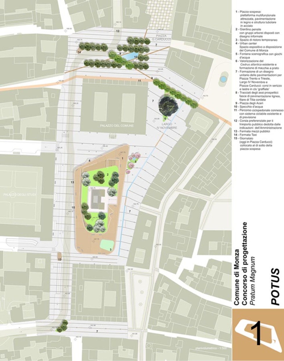 La proposta progettuale, in relazione agli obiettivi espressi, parte innanzitutto dalla necessità di ricucire Piazza Carducci, Largo IV Novembre e Piazza Trento e Trieste con la formazione di un disegno unitario delle pavimentazioni, l’impiego di materiali uniformi, lo studio coordinato della composizione vegetale e degli arredi, l’inserimento dell’elemento acqua, consentono la formazione di uno spazio omogeneo che renda riconoscibili le singole piazze come appartenenti al medesimo luogo.